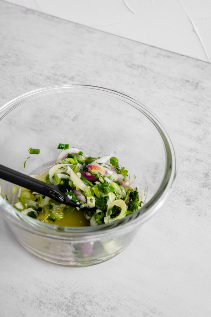 - Scallion Sauce: Meanwhile, in a small bowl, combine green onions, ginger, oil, tamari, vinegar, 1/16 teaspoon salt, and 1/32 teaspoon pepper. Set aside (or place in the refrigerator until serving).