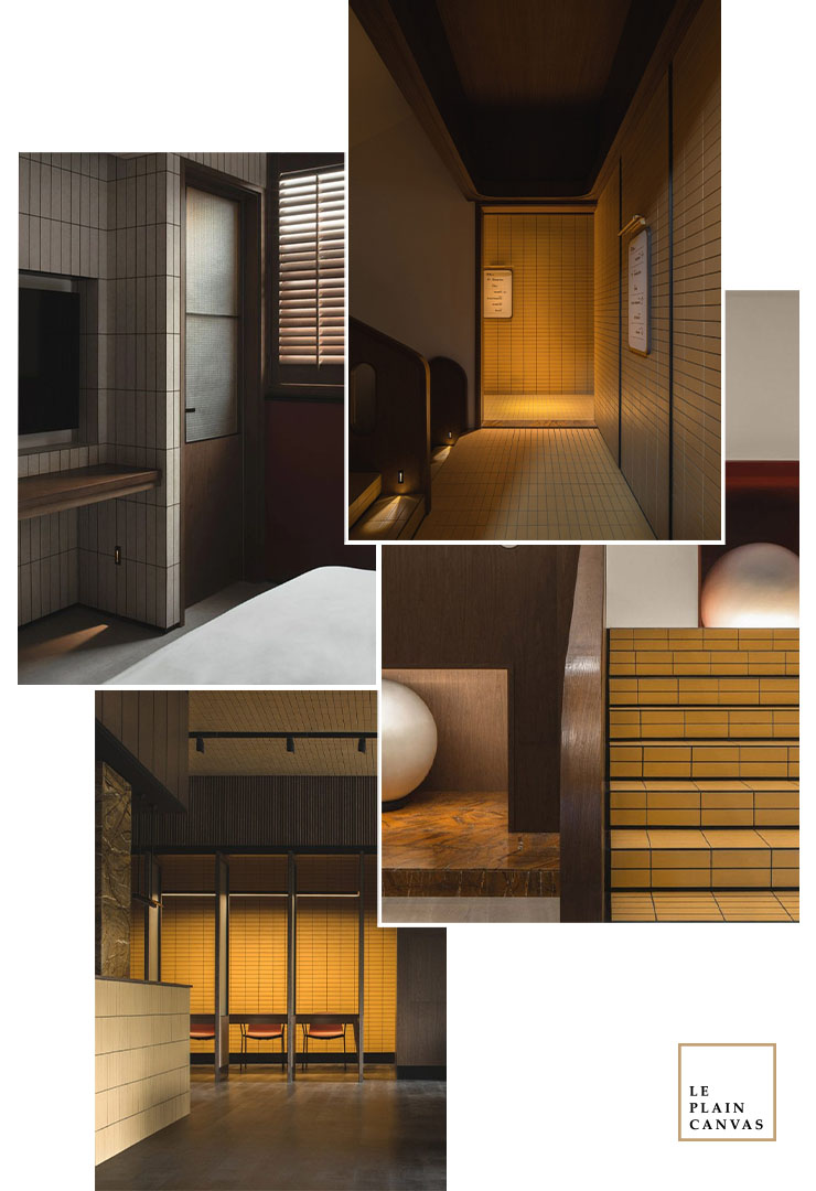 The exterior of the hotel is clad in a charcoal-colored calcium silicate board. An entranceway clad in walnut paneling and rectangular mustard yellow tiles guides travelers inside. The mustard tiles continue inside the hotel’s lobby where they stretch across an arched ceiling that the architects said was installed to evoke a homely atmosphere.