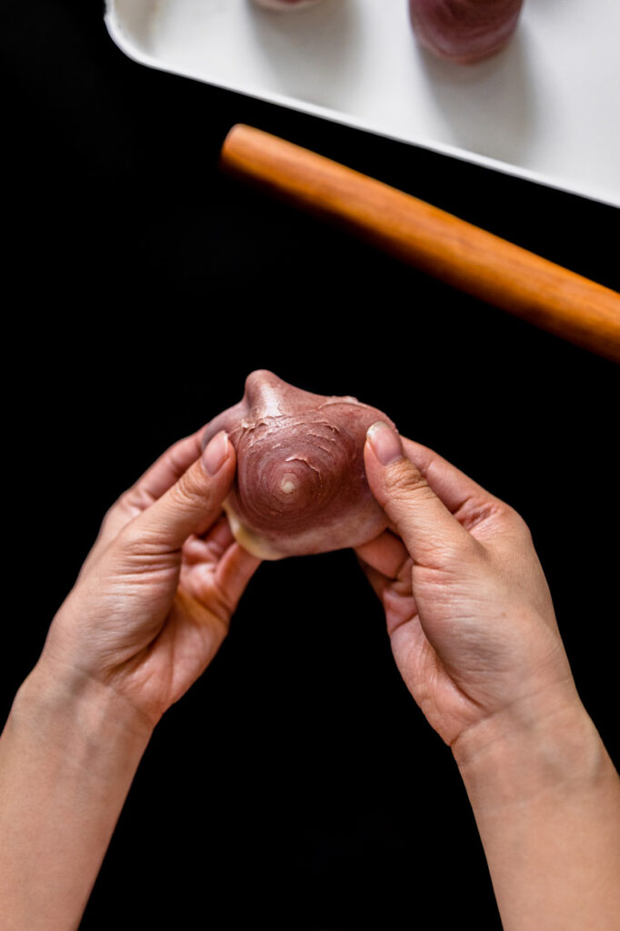 You can get the whole root for both taro and purple sweet potato at the wet market. You can replace the purple sweet potato with all taro as it is only used to add some colour to the filling. However, you can also get the taro root that has been peeled from the store. If you get the whole root, wear gloves and peel the skin (As taro may cause itchiness on the skin) and weigh to get 350 and 200 grams respectively. Cut into thick slices and then steam 15 minutes over high heat or until you can easily mash with a fork.