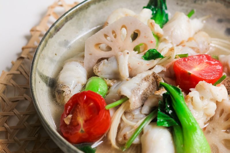 - Add lotus root, baby bok choy and tomatoes, cook briefly and turn off heat.